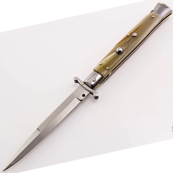 Ein einzigartiges traditionelles Stilett, inspiriert vom Originalmodell der italienischen Springmesser von Frank Beltrame. Hier hat der Hersteller bestimmte Herstellungsmängel beseitigt und verbessert, was es zu einem zuverlässigen und präzisen Messer hinsichtlich Auslösung und Robustheit der Klinge in der geöffneten Position machte. Die Scheide ist mit einer kleinen Niete an der Klinge befestigt, die Einsätze bestehen aus Messing und die Klinge besteht aus rostfreiem AISI 420 MA5M-Stahl mit einer Härte von 56 HRC.