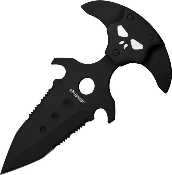 Insgesamt 5 Zoll. 2 1/2 Zoll teilweise gezahnte, zweischneidige Dolchklinge. Einteilige Edelstahlkonstruktion mit schwarzem Finish und integriertem Schutz. T-Griff mit schwarzen Aluminiumschalen. Schwarze Gürtelscheide aus Nylon.