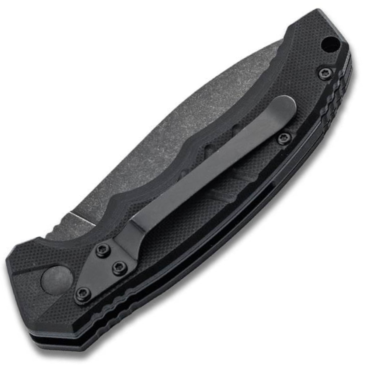 Böker Plus Intention II, navržený jako taktický automatický nůž, přesvědčí nejen při používání, ale také bez námahy zvládá všechny každodenní řezací úkoly. Stisknutím tlačítka se uvolní čepel dýky z D2, která byla na jedné straně odstraněna a napnutí pružiny za ní ji pak automaticky otevře. Nůž zajišťuje i úhledně uzamykatelný posuvný zámek proti náhodnému uvolnění. Ergonomicky tvarovaná rukojeť je vyrobena ze strukturovaného, ​​černého G10, žebrování v oblasti opěrky palce a výrazné vybrání pro prsty dále zlepšují polohu ruky. Taktické nároky podtrhuje tlumený černý stonewash povrch čepele.