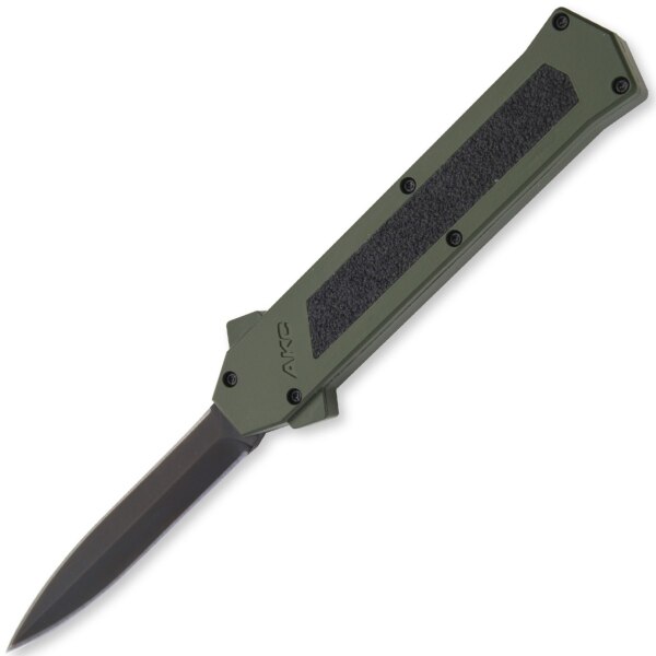 This AKC OTF is called “F16″, like the Fighting Falcon supersonic fighter aircraft of United States Air Force.This is an awesome automatic knife, strong and solid mechanism with double springs for durable and faster opening. Bladeplay is almost zero. Press the button forward and the blade rockets out. Pull the firing button back and the blade retracts safely. Very simple! The action is fast and the switchblade is light and ergonomic. The aluminium handle has a military green finish with black sandpaper insert for a safe grip. Black dagger blade, black pocket clip. Its design and proportions remind of the italian stiletto. A great EDC.