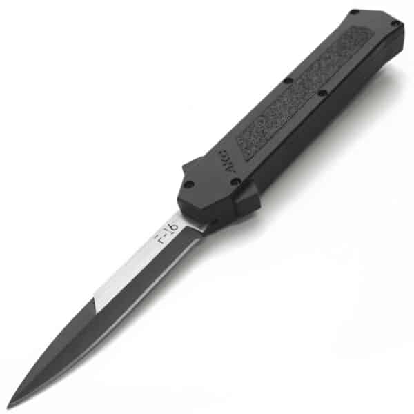 This AKC OTF is called “F16″, like the Fighting Falcon supersonic fighter aircraft of United States Air Force.This is an awesome automatic knife, strong and solid mechanism with double springs for durable and faster opening. Bladeplay is almost zero. Press the button forward and the blade rockets out. Pull the firing button back and the blade retracts safely. Very simple! The action is fast and the switchblade is light and ergonomic. The aluminium handle has a black finish with black sandpaper insert for a safe grip. Two-Tone bayonet blade, black pocket clip. Its design and proportions remind of the italian stiletto. A great EDC.