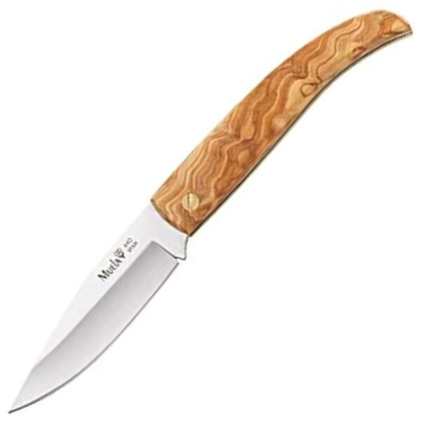 A folding pocket knife from the Spanish company Muela, with a simple and elegant design. The blade is made of quality molybdenum vanadium steel with a hardness of 57 – 61 HRC. The attachments are metal and have handles made of olive wood. The blade is fixed in the open and closed state by the pressure of the spine pen, the knife has no other safety device. A very nicely crafted knife for everyday use.
