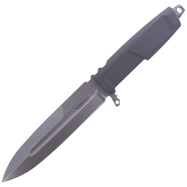 Extrema Ratio developed the first knife of a new production line, called CONTACT. It has a blade with a lance-shaped profile, a flat grinding and a diamond-shaped geometry. It has got a lower guard branch to protect the hand from accidental cuts, upper jumping to improve grip, a concave fuller along the entire length of the blade and a generous thickness blade (6.30mm) All these details make the Contact the elder brother of the now famous Requiem, revisited in proportions and in some technical features. The first of a new line of multipurpose knives. The blade is made in Böhler N690 steel with a hardness of 58 HRC and a chemical burnishing coating for the Black version. All other colours in production have got a blade with Stone Washed finishing. The handle is still in forprene . It is no more assembled by the side screws but thanks to the shank in truncated cone-shaped stainless steel that is screwed to the bottom and goes to fit inside a special seat, which makes it solid. In this way the knife is well balanced. The sheath is minimalist; most of the fabric has been cut off; it has got a 2nd level retention system, remembering the style of the model it was inspired by. The main shell is injection-molded in shockproof nylon. The secondary retention system is reversible for ambidextrous users. The blade is guided into the sheath thanks to its cone shape that lends itself well to the rapid insertion and extraction of the blade. To extract the blade, a pressure on the trigger will be sufficient, thus releasing the safety that holds it securely in the sheath. In the horizontal slits of the sheath a system is added, which fixes the blade to avoid shaking noises when it is stored inside. The back side of the nylon sheath is M.O.L.L.E. compatible. The textile part is reduced to its minimum and has got the classic two-button safety strap with a belt loop and a thigh band with rubber reinforcement for anti-rotation. Extrema Ratio aims at this new line by minimizing thickness and size of the knife, but not saving on structural strength and safety accessories.