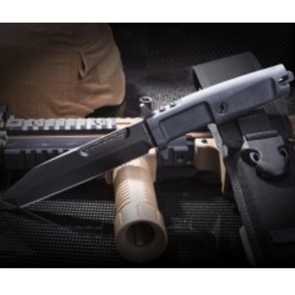Fixed Knife Extrema Ratio FULCRUM S BLACK. Probably a milestone among multipurpose knives. It is used on a large scale in Afghanistan as standard equipment by members of the Italian “Nibbio” mission and is part of an experimental project of the Alpine Troops Headquarters aimed at the renewal of individual equipment. In preparation for this mission, the Alpine Troops Command coordinated a team of companies in the implementation of a new and complete experimental set of individual equipment. Extrema Ratio is the company chosen by the Alpine Command to develop a multipurpose knife suitable for infantry, a knife that can be used in any action and can successfully solve any type of problem, even when specialized equipment proves insufficient. it was so successful that the multi-purpose knife then led to the development of the Fulcrum bayonet, which had the same features but could be attached to an issued rifle. The Fulcrum is an extremely robust and versatile knife, the blade can withstand a load of over 150 kg without breaking, the tip is incredibly robust and the “tanto” profile means that the knife can be used for long periods of time without affecting the sharpness of the last section, this guarantees, together with the partially sharp dorsal blade (civilian version does not include this), its penetration ability, which is essential in close combat against targets with heavy clothing, clothing and soft ballistic protection. The forward center of gravity and weight make it suitable for heavy field work. The speed and facilities with which both routine and emergency maintenance can be performed make the Fulcrum an excellent choice for large-scale applications from an economic and administrative point of view. Specifications Blade length: 170mm Blade: Bohler N690 Stainless Steel, 58HRC Thickness: 6.3mm Overall length: 308mm Handle material: Propren Includes black ABS and nylon belt sheath with integrated wire cutter Weight: 13.13 oz. (378g) Made in Italy