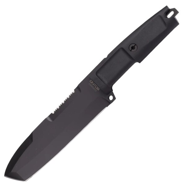 Fixed Knife Extrema Ratio ONTOS GREEN NO KIT Growing demand from professionals among our clients convinced Extrema Ratio to design a survival tool for all seasons. ONTOS (“thing” in Greek) is a pure field knife, tough and heavy despite its compact size. The serrated segment on the back of the blade is intended as a support element that will never catch without a sharp edge ready for use. A MOLLE-compatible nylon thigh holster will stay on even in the event of a retreat, where the soldier would drop most of his cumbersome essential gear. A survival kit can be purchased separately to attach to the knife sheath. Available versions: ONTOS BLACK, ONTOS GREEN. G. WEIGHT: 411 OZ. WEIGHT: 14.5 BLADE LENGTH (MM): 168 BLADE LENGTH (IN): 6.6 OVERALL LENGTH (MM): 299 OVERALL LENGTH (H): 11.8 BLADE THICKNESS (MM): 6.3 BLADE THICKNESS (IN): 0.25 BLADE MATERIAL: BÖHLER N690 STEEL (58HRC) BLADE FINISH: LAYING MIL-C-13924 MAIN GRID: FLAT PARTIAL TEETH (MM): 40 PARTIAL TEETH (IN): 1, 6 HANDLE MATERIAL: FORPRENE
