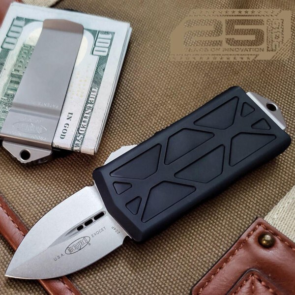 The Exocet is a robust Cali-Legal OTF automatic from knife manufacturer Microtech. The knife has a wide double-edged blade and an anodized aluminum handle with a thumb safety. Get a powerful Microtech in a compact Exocet package. The knife has a large wide pocket clip so you can keep it clipped inside your pocket or use it as a super cool money clip. Add this versatile knife to your collection today!