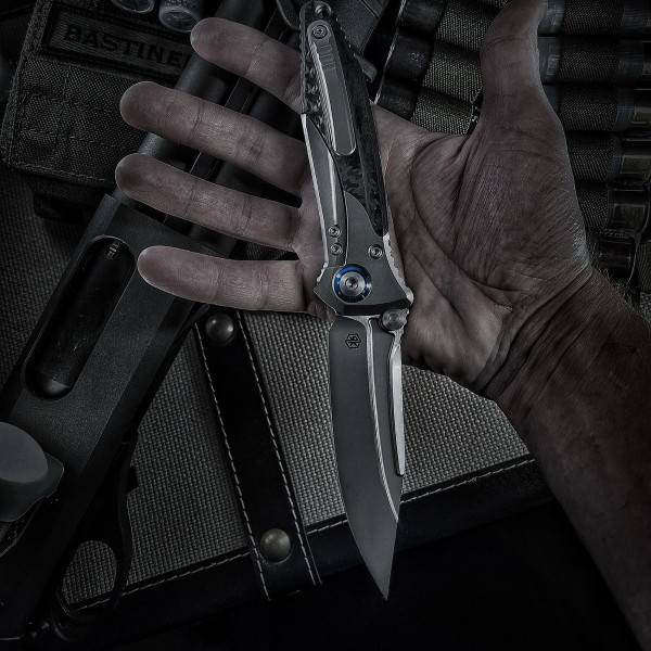 Blasted Titanium handle with Carbon Fiber scales. It features a bead blasted single edge M390 steel blade. Blue titanium pivot collar.