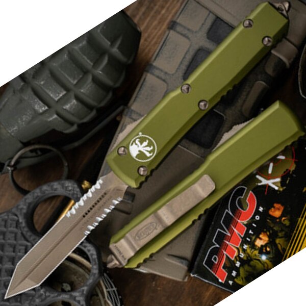 The Microtech Spartan Ultratech handle is making noise in the knife world. The Double Edge Tanto blade is quite appealing and offers a new blade style that could be the norm for MT. The dual action spring loaded OTF that started it all is the smoothest operating out the front knife you will find. It features a 3.4″ Spartan (double edge tanto) blade. The Spartan Ultratech has a 5″ black anodized 6061-T6 aluminum bottom handle with bronze finished pocket clip, glass breaker and hardware.