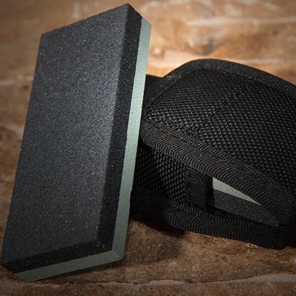 Double grain silicon carbide grinding wheel. It consists of a coarse grain side (180) and a fine grain side (400) to perform more powerful sharpening. Comes with cordura sheath.