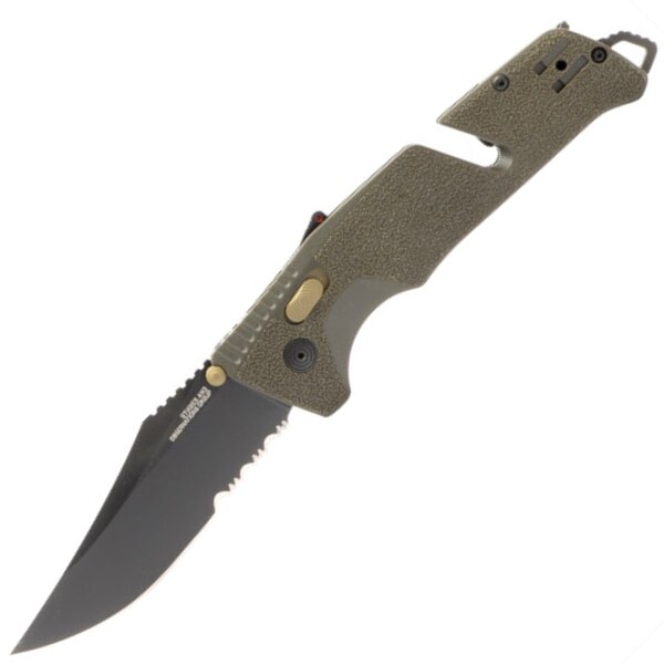 A folding knife designed for professional users, Trident AT features rapid assisted opening with SOG’s innovative ambidextrous AT-XR Lock, as well as integrated line cutter and glass breaker. Trident AT is easy to carry, with a highly functional 3.75″ cryogenically heat-treated D2 stainless steel blade. Its powerful AT-XR locking mechanism also features built-in blade locking safety and spine-mounted safety system. The next evolution of the field-proven Trident pocket knife.
