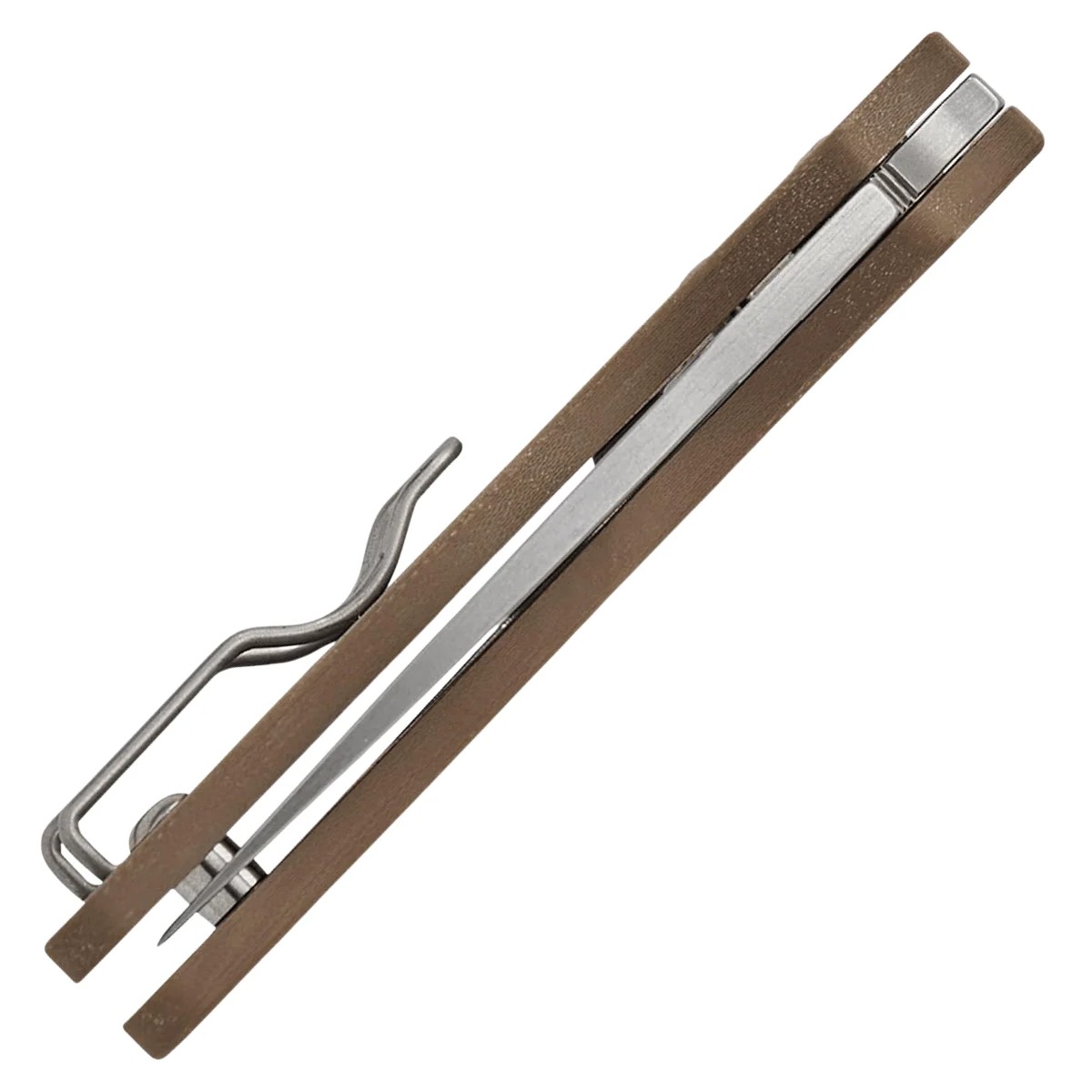 Rukojeť z hnědé G-10 je ergonomicky navržena tak, aby dobře seděla v dlani a poskytovala jistý úchop i při delší práci. Texturovaný povrch zvyšuje přilnavost v suchých i vlhkých podmínkách.
