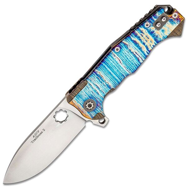 Andre De Villiers Trailboss 2 S35VN Cuchillo plegable con mangos de titanio y lluvia satinada.