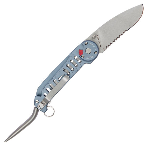 La hoja, extendida hasta 87 mm, tiene dentados en la base, mientras que la punta tiene un borde plano que permite un corte simétrico con un soporte más amplio, mientras que el proceso final de lavado a la piedra protege más contra la corrosión en el ambiente marino.