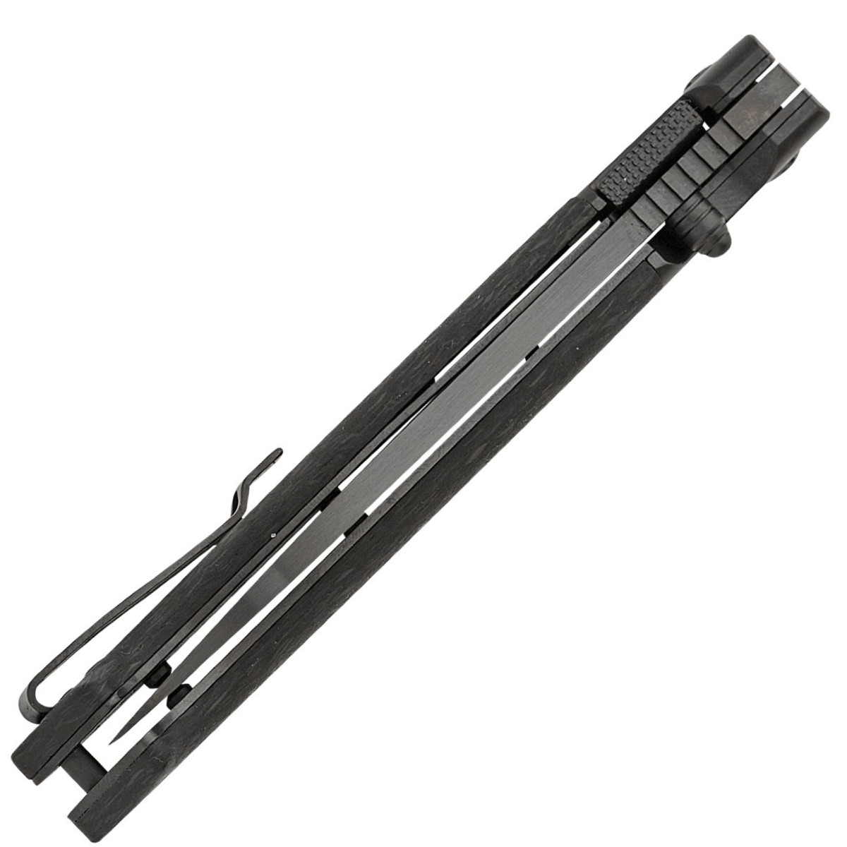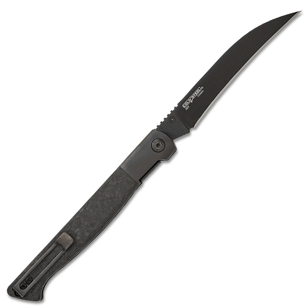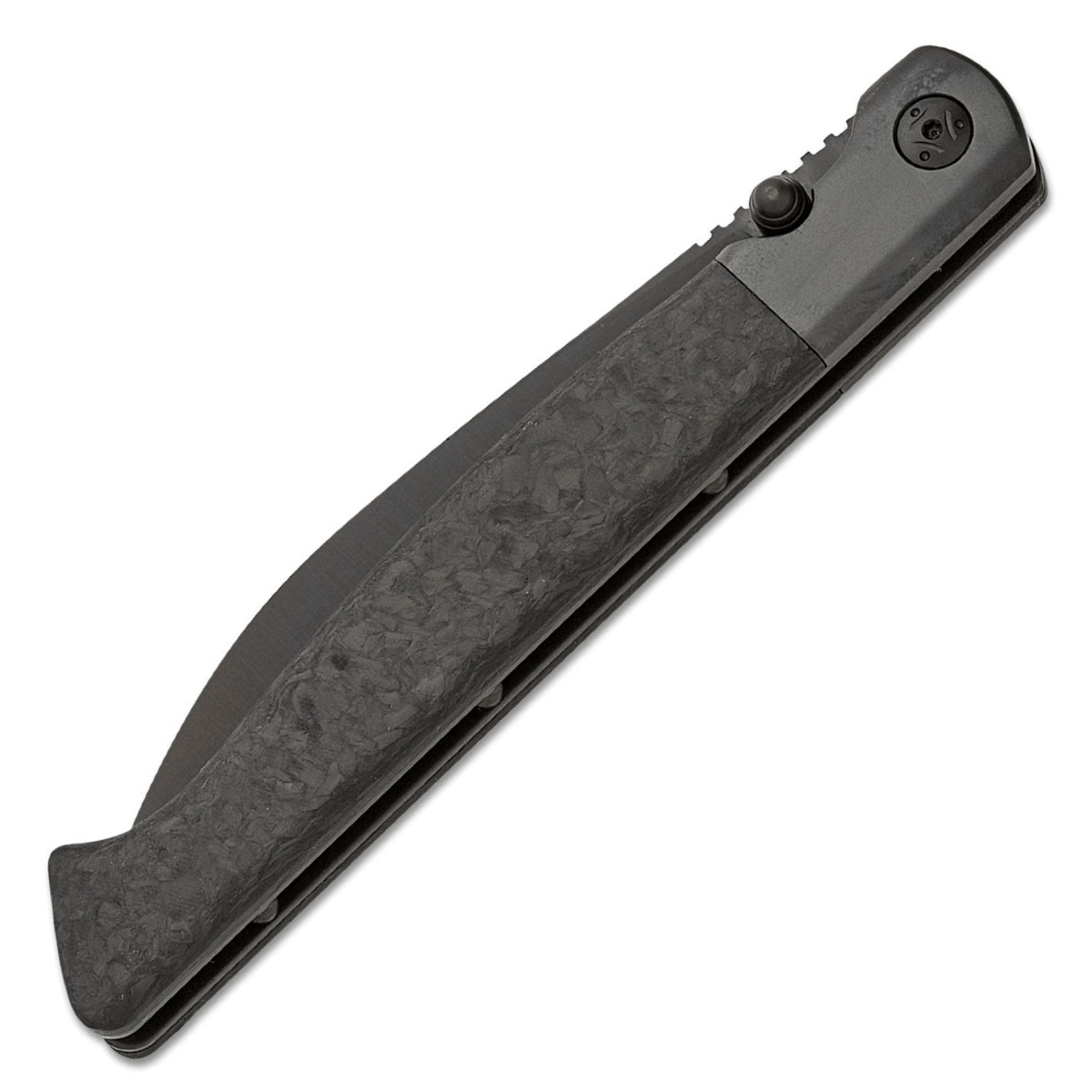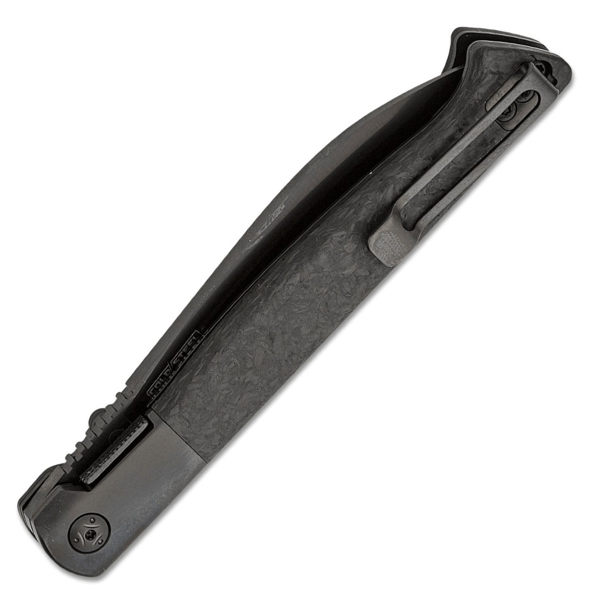 Prémiová ocel CPM‑20CV poskytuje vynikající retenci ostří a odolnost proti opotřebení, takže si nůž udrží ostrost i při intenzivním používání. Černá povrchová úprava čepele dodává nenápadný taktický vzhled a zároveň zvyšuje odolnost povrchu proti korozi. Rukojeť z kovaného uhlíkového vlákna je lehká, pevná a ergonomicky tvarovaná tak, aby držela v ruce jistě i při delší práci.