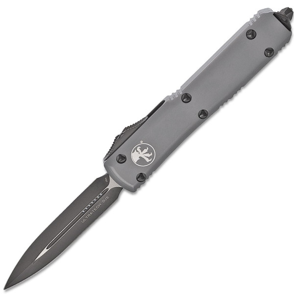 Vystřelovací Nůž Microtech Ultratech 122-1 GY – Ultratech je vybaven dvojitou čepelí s černou povrchovou úpravou a jednoduchými řeznými hranami. Má tvarovanou hliníkovou rukojeť z eloxovaného hliníku 6061-T6 v šedé barvě, pojistkou a nerezovou výztuhou.