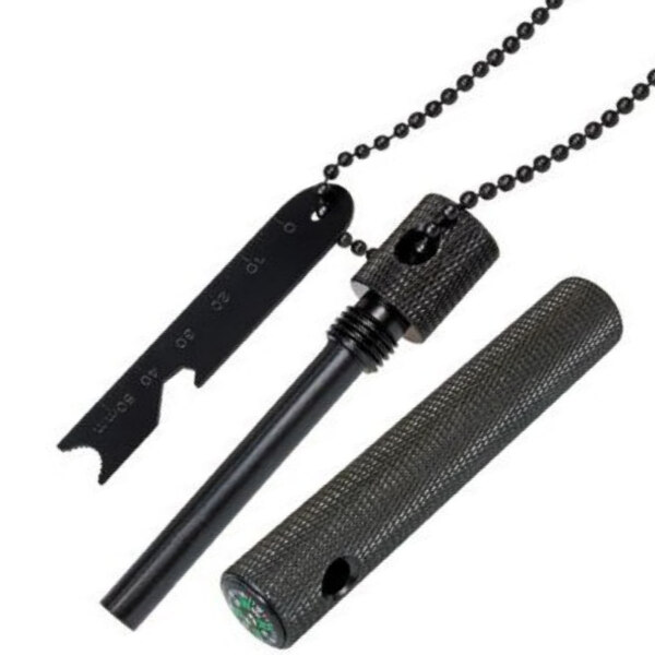 Nepostradatelný nástroj v nouzových situacích, hořčíkové křesadlo. Třísky, které lze vyrobit přiloženým škrabákem, pomáhají velice rychle zapálit táborový oheň nebo nouzovou pochodeň. Robustní konstrukce v hliníkovém těle se závitem a protiskluzovou úpravou. Kompas je integrovaný do pouzdra.
