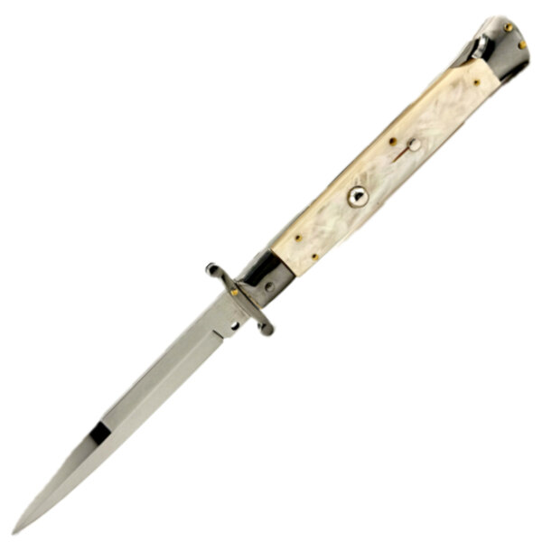 Frank Beltrame 11″ MOP Swinguard Stiletto Knife je ikonický vystřelovací nůž inspirovaný klasickým italským designem stiletta – ztělesňuje eleganci, ruční řemeslné zpracování a mechanickou preciznost. Tento model vyniká nejen efektním automatickým otevíráním, ale také luxusními materiály – především rukojetí s perleťovou výplní (Mother of Pearl), která dodává noži jedinečný a ušlechtilý vzhled.