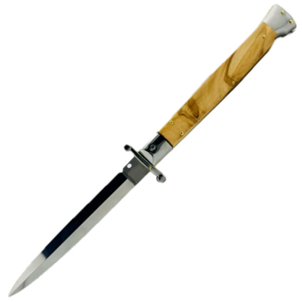 Beltrame Swinguard Olive Wood 28 cm je elegantní vystřelovací zavírací nůž z italské produkce, který kombinuje tradiční design, kvalitní řemeslné zpracování a luxusní přírodní materiály. Typický pro tento model je ikonický „swinguard” chránič prstů, který při otevření nože vyskočí spolu s čepelí a poskytuje lepší jistotu úchopu.