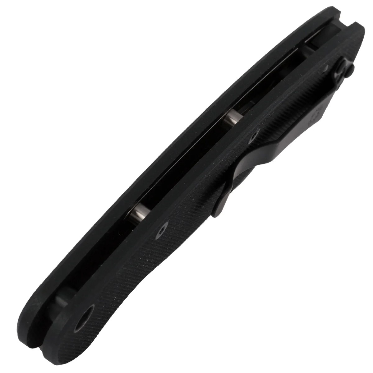 Černá G-10 rukojeť nabízí agresivní texturu a jistý úchop i v mokrých podmínkách, zatímco černěná čepel z kvalitní oceli zajišťuje nízký odraz světla a profesionální vzhled.