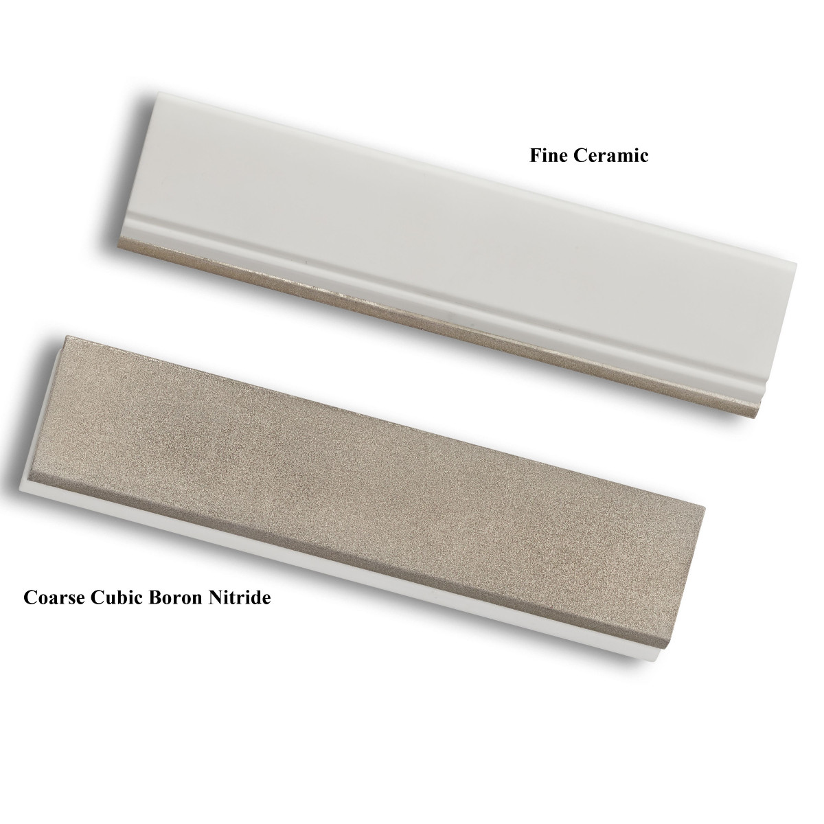 - Materiál povrchu: CBN (Cubic Boron Nitride) – hrubý a jemný grit na jedné straně
