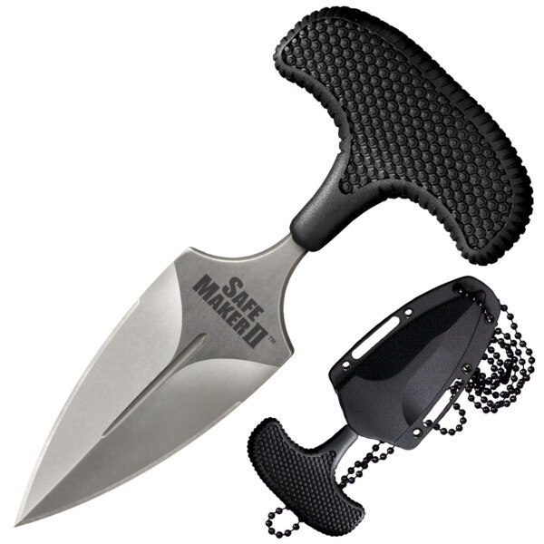 Společnost Cold Steel vyrábí tlačné nože již více než čtvrt století. V průběhu let jsme neustále zdokonalovali naše designy, vyřazovali některé funkce a vylepšovali další. Neustále se snažíme vyrábět nejlepší tlačný nůž na světě. Naše řada Safe Maker představuje vrchol našeho učení, zkušeností, testování a vývoje. Čepele, hřídele a příchytky ve tvaru písmene „T“ jsou vyrobeny z jednoho pevného kusu japonské nerezové oceli AUS8A s povrchovou úpravou kamenem a poté jsou tepelně zpracovány vakuově a kaleny pod nulou pro zvýšení pevnosti a výkonu. Tvarovaná rukojeť Kray-Ex pro větší pohodlí a bezpečnost. K dispozici ve dvou velikostech; Každý Safe Maker obsahuje snadno zakrytý a robustní pouzdro / opasek Secure-Ex.