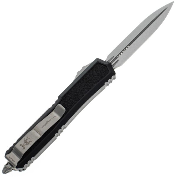 Black Double Edge (D/E) Makora Signature Series with a stonewash finished plain edge blade. Double action Out the Front (OTF) knife. Black anodized 6061-T6 aluminum handle with grip tape insert and M390 steel blade.
