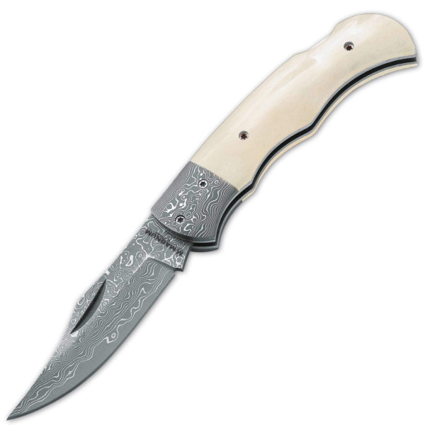 The Magnum Damascus Bone is a magnificent Damascus Pocket Knife featuring a finely drawn Damascus blade and Damascus bolsters. The scales are made of polished bones which results in a beautiful contrast to the darker Damascus steel. The blade is locked by a classic backlock.