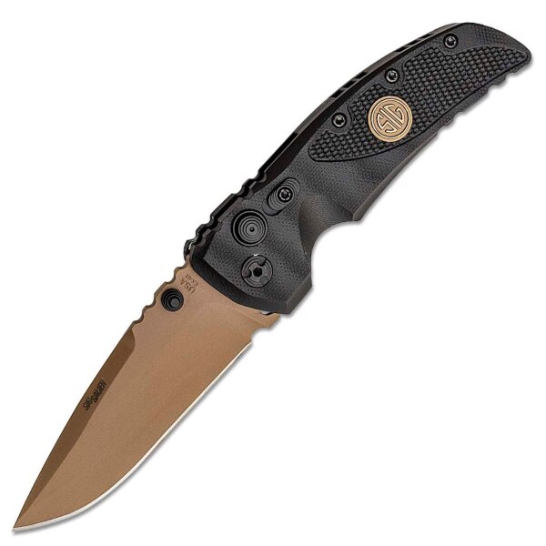 Ergonomická rukojeť z černého G10 kompozitu poskytuje jistý úchop i v náročných podmínkách, zatímco knoflíkový zámek (button lock) zajišťuje snadné a bezpečné ovládání jednou rukou. Tento model je skvělým doplňkem k palným zbraním SIG Emperor Scorpion, nejen designem, ale i funkčností.