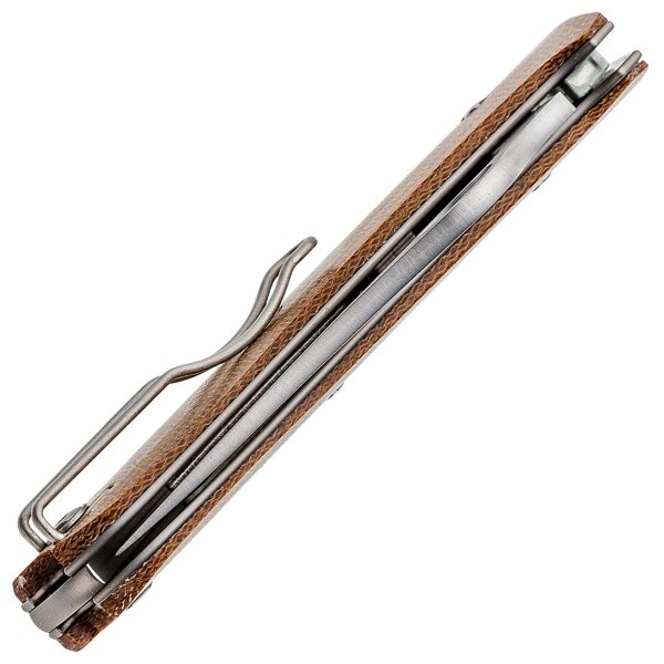 Čepel SpyOpera je podepřena robustním zámkovým mechanismem, který ji při použití bezpečně uzamkne a zároveň umožňuje snadné zavírání jednou rukou kteroukoli rukou. Hladká, ergonomická rukojeť nože je vyrobena z titanových vložek, backspaceru z nerezové oceli a šupin z hnědého plátna Micarta. Mistrovsky tvarované, aby poskytovaly pohodlné uchopení, váhy zvýrazňují klasický oldschoolový vzhled vrstvené Micarty a jsou připevněny třemi stylovými šrouby Torx na každé straně. Hřbety čepele, zajišťovací tyč a backspacer jsou také pečlivě zaobleny pro styl a větší pohodlí. Tento detail je na továrně vyrobených nožích vidět jen zřídka a skutečně povyšuje zpracování SpyOpera na elitní úroveň.