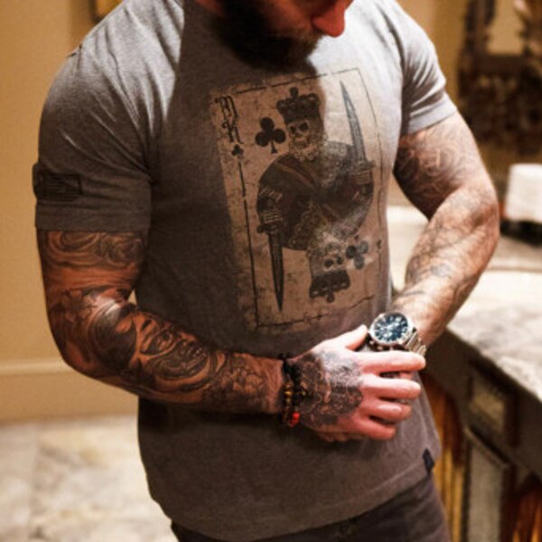 Toto unisex tričko zo zmesi bavlny, ponúkané v tmavo šedej vresovo šedej, má našu zvetranú originálnu grafiku King Card.