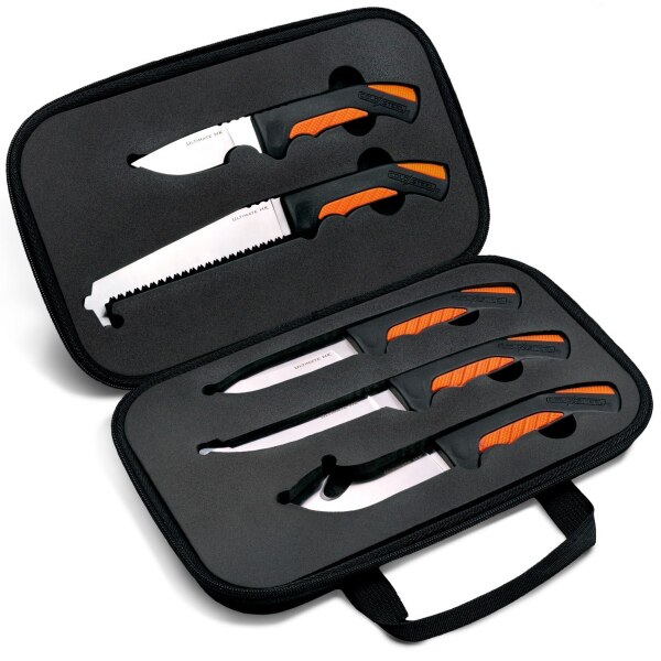 Toto je sada pevných čepelí, ktoré každý lovec potrebuje. Obsahuje takmer všetko potrebné na poľné obliekanie veľkej i malej zveri, všetko v jednom výhodnom balení. V sade je päť robustných čepelí, z ktorých každá má špecifický účel a použitie. Čepele ostré ako britva sú vyrobené z nerezovej ocele 4116 a sú pripravené prakticky na akúkoľvek úlohu. Všetky nože sú dodávané s dvojitou textúrovanou, ergonomicky navrhnutou rukoväťou a sada je balená v pevnom prenosnom kufríku.