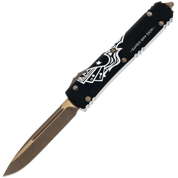 Vystreľovací Nôž Microtech Ultratech Bronze Apocalyptic Deadman’s Hand Engraving 121-13DMS